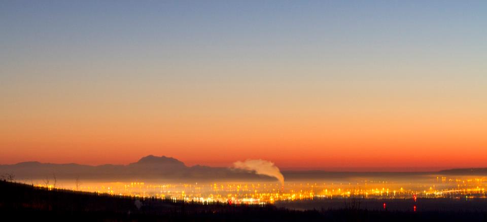 Above: At 10:28 a.m. the sun has yet to rise above tree line, snow can be seen blowing off peaks in the Alaska Range. Elliott Highway, 37 miles north of Fairbanks.