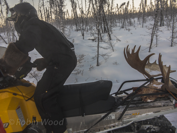 Sporting thick fur mittens and hauling a moose skull, the only person we encountered on the 6-hour ski said “you have a ways to go.” Taken 2:21p.m., Nov. 30, 2013.