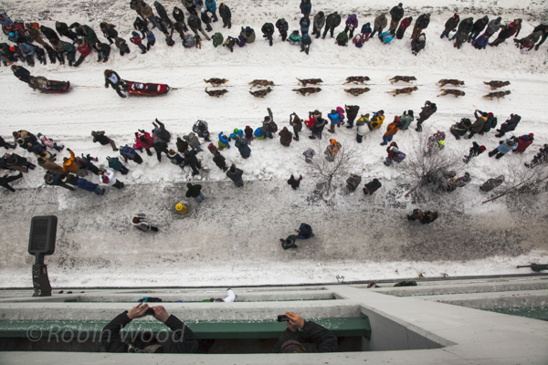 I wasn’t on assignment so I casually photographed the race from the top of the parking garage. I love the chance to combine rugged dog mushing with a city scape – particularly from a high perspective.