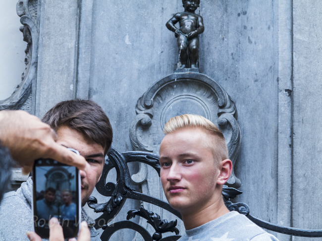 Above: A duo poses for a picture in front of Manneken Pis, a tiny bronze statue of a young boy urinating. I like taking pictures of people taking pictures, this one has a quite comical element. August 10, 2014.