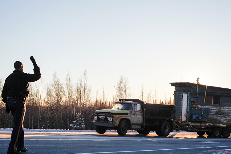 An Alaska State Trooper arrives on the scene of a dead vehicle to direct traffic.