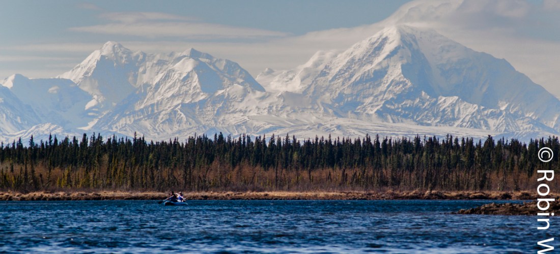 Above: The Eastern Alaska Range backdrops the Delta Clear Water, a spring-fed river in Interior Alaska. A small canoe can be seen in the lower third of the photo,