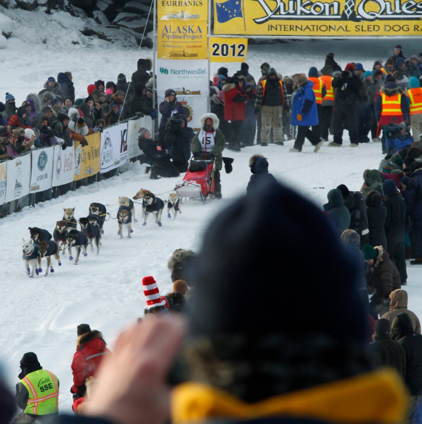 The race alternates start and finish between Fairbanks and Whitehorse, this year was Fairbanks. The Chena River in downtown Fairbanks is the usual starting spot, but due to unseasonably warm temperatures the ice was deemed unstable and the race started on 2nd Avenue. Hundreds, if not thousands, of people lined the street to send off racers.